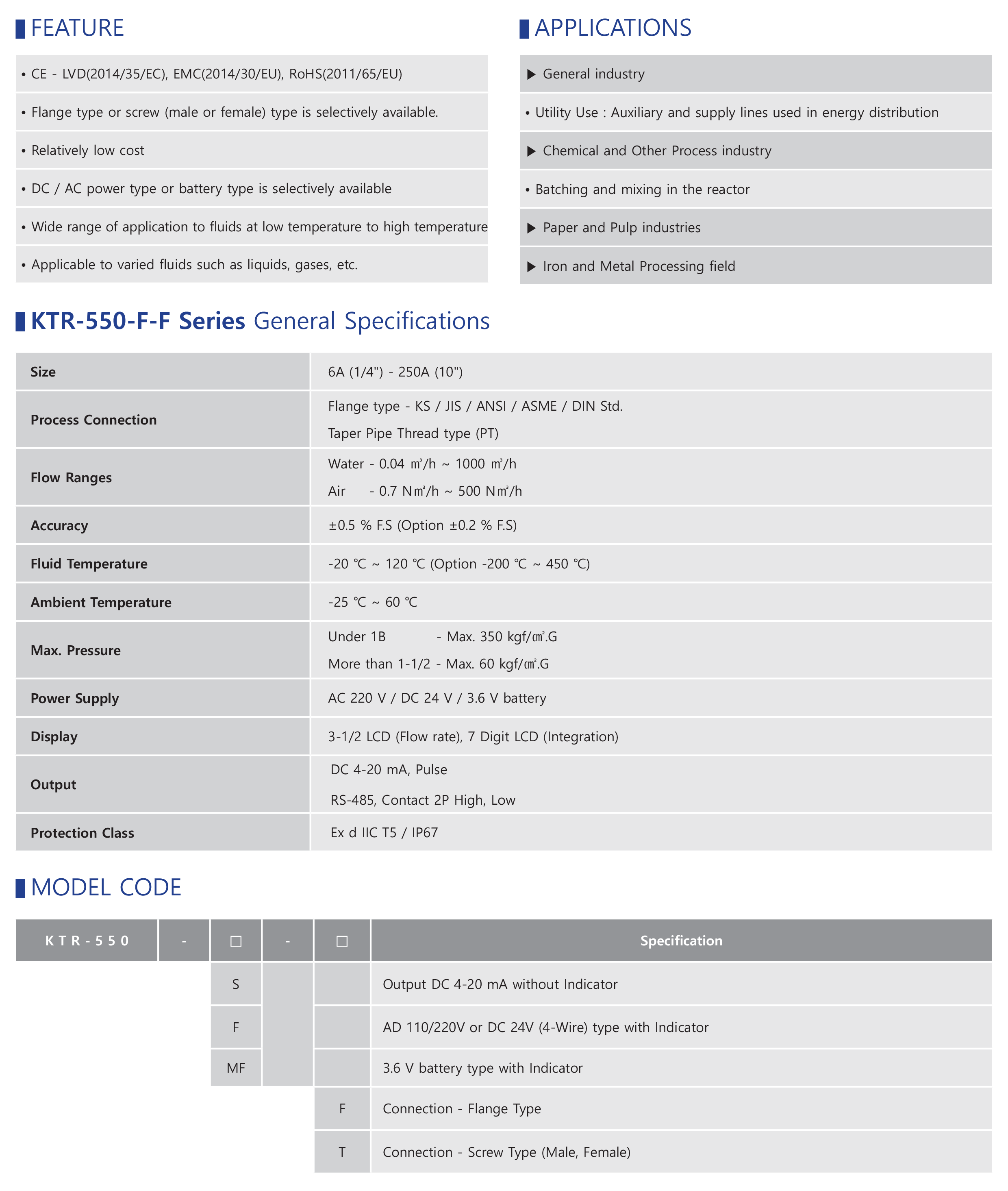 KTR-550-F-F can be applied to alcohol, toluene, etc. which are not electrically conductive. And it can be used also in oil and gas, power plants, pharmaceutical and pulp & paper-making industry. However, it is recommended to not use for fluids containing sludge or highly viscous fluids. Also, it can be provided in flange type or screw (male or female) type while being able to cope with various piping conditions.