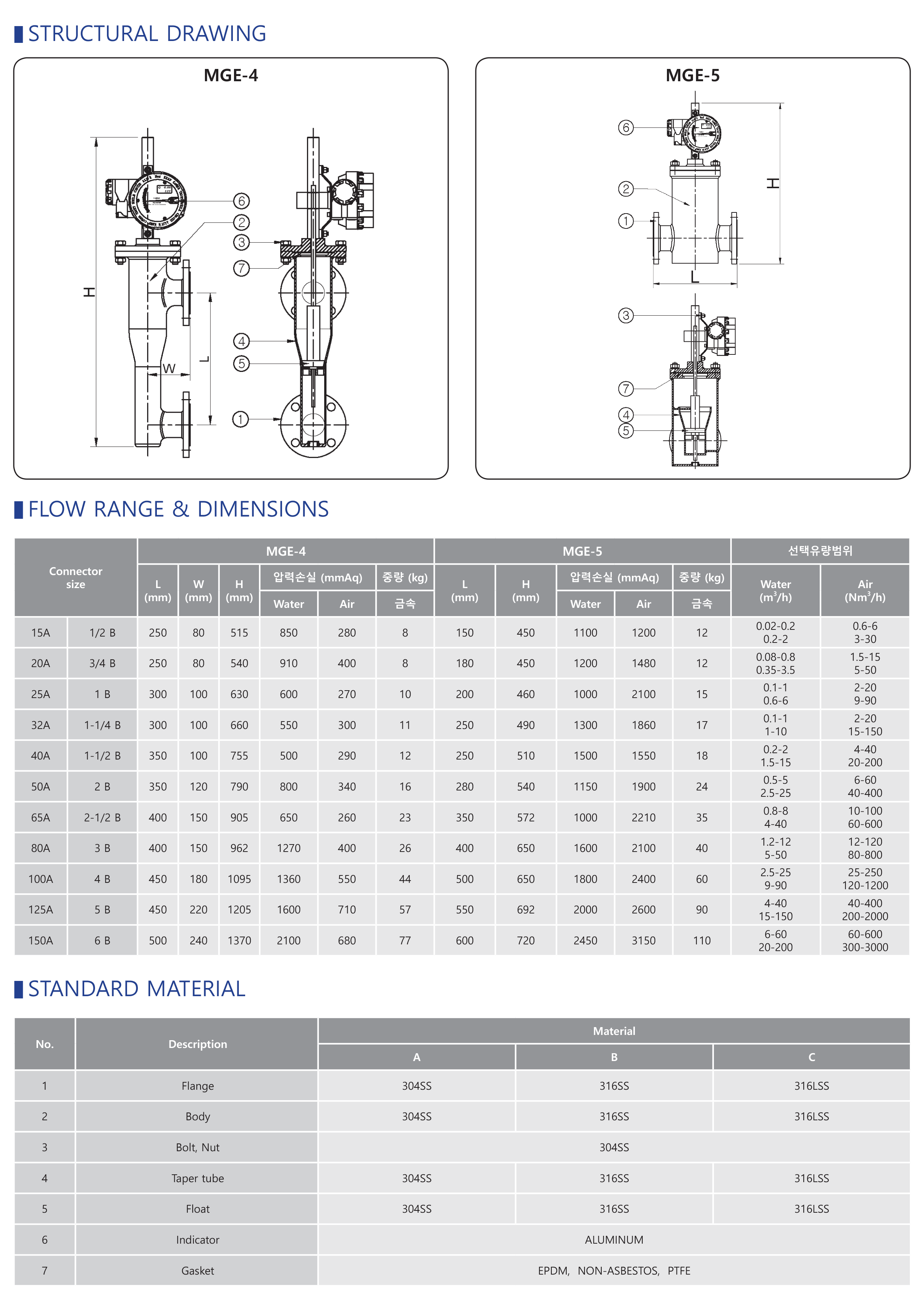MGE Series 는 기본적인 기계식 지시계에서부터 DC4-20 mA 출력과 Hart 통신 기능이 있는 모듈형 금속관 면적 유량계입니다. 배관을 통과하는 유체의 양을 지시부의 지침을 통해 직관적으로 확인이 가능하고 순간유량 및 적산량을 디지털로 현장에서 확인 할 수 있습니다.