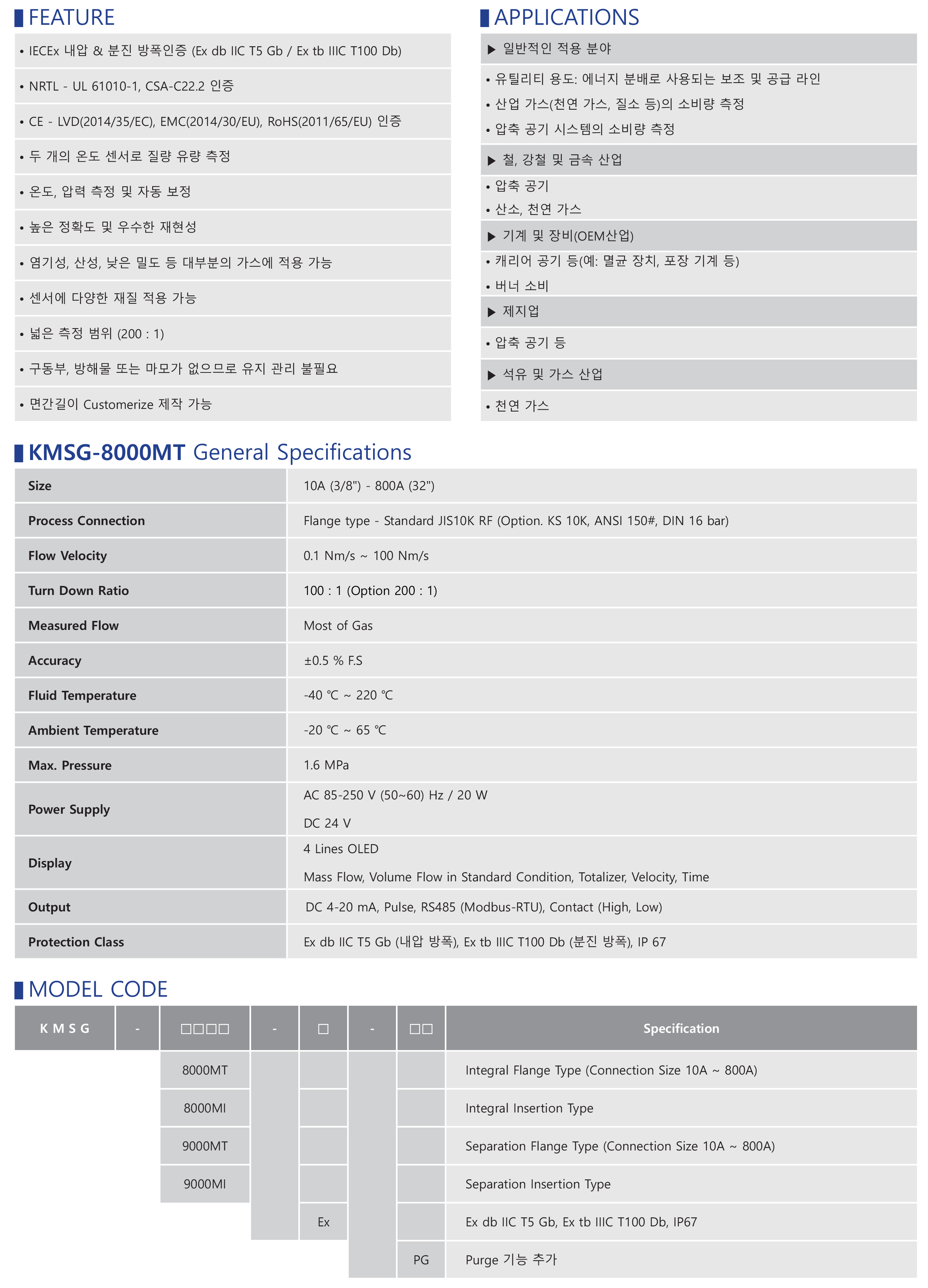 KMSG-8000MT 은 기체를 유체로 사용하는 프로세스에서 유량 측정을 위해 특별히 설계 된 열식 질량 유량계입니다. 최고의 기술이 집약 된 유량계는 특히 높은 정확도와 다양한 자기 진단이 필요한 현장에 적합합니다.