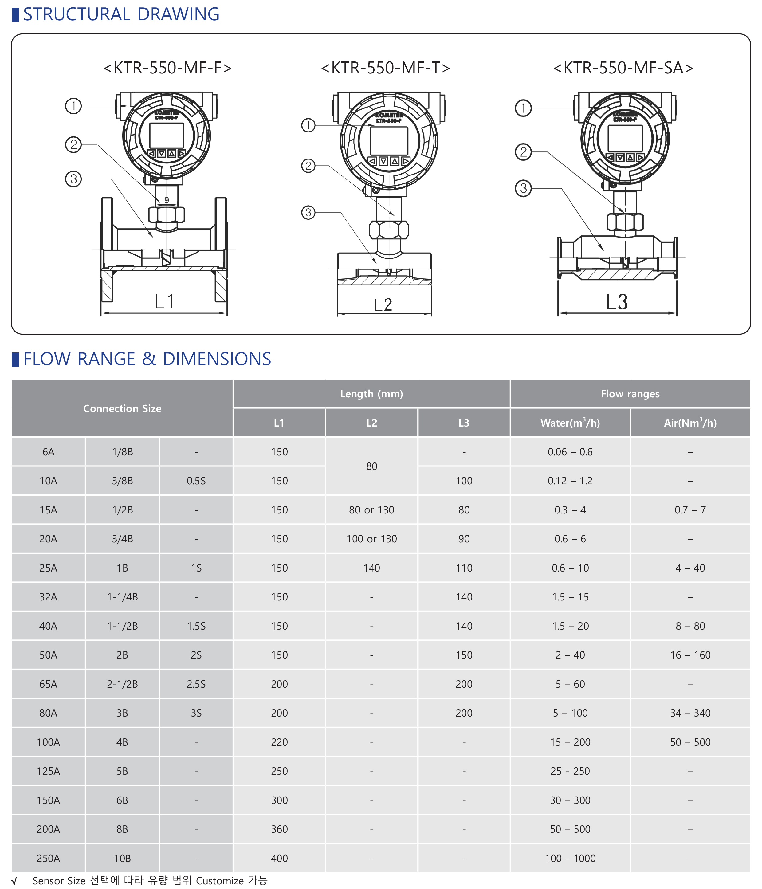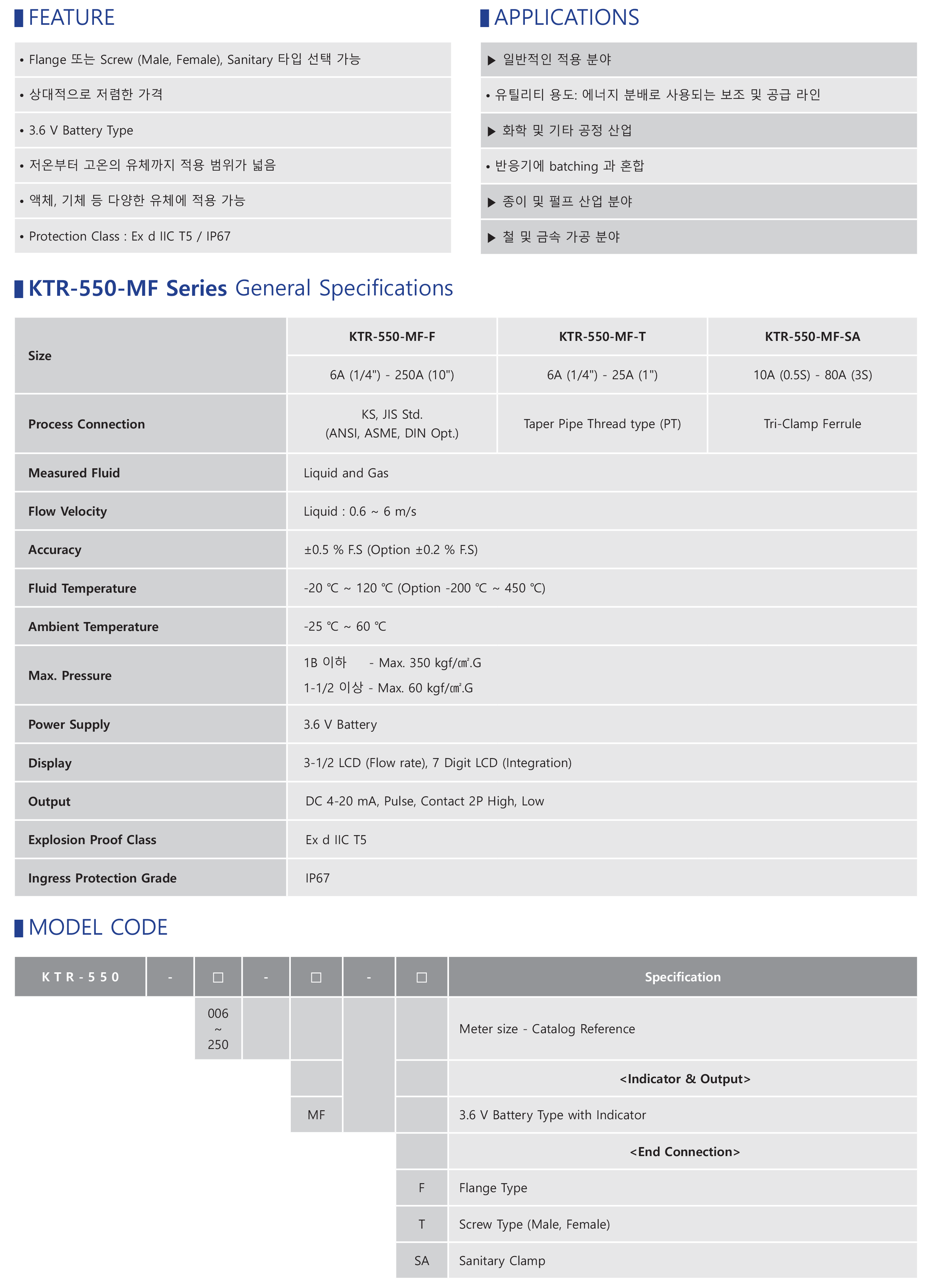 KTR-550-MF-F 은 알코올, 톨루엔 등의 전기 전도도가 없는 유체에 적용가능하며 석유 가스, 발전소, 제약 및 펄프 & 제지 등의 산업 현장에 또한 이용 할 수 있습니다. 그러나 슬러지가 있거나 점도가 높은 유체에는 사용하지 않는 것을 권장 드립니다. 또한 플랜지 타입 또는 Screw (Male, Female) 타입으로도 제공 가능하여 다양한 배관 조건에 충족 가능합니다.