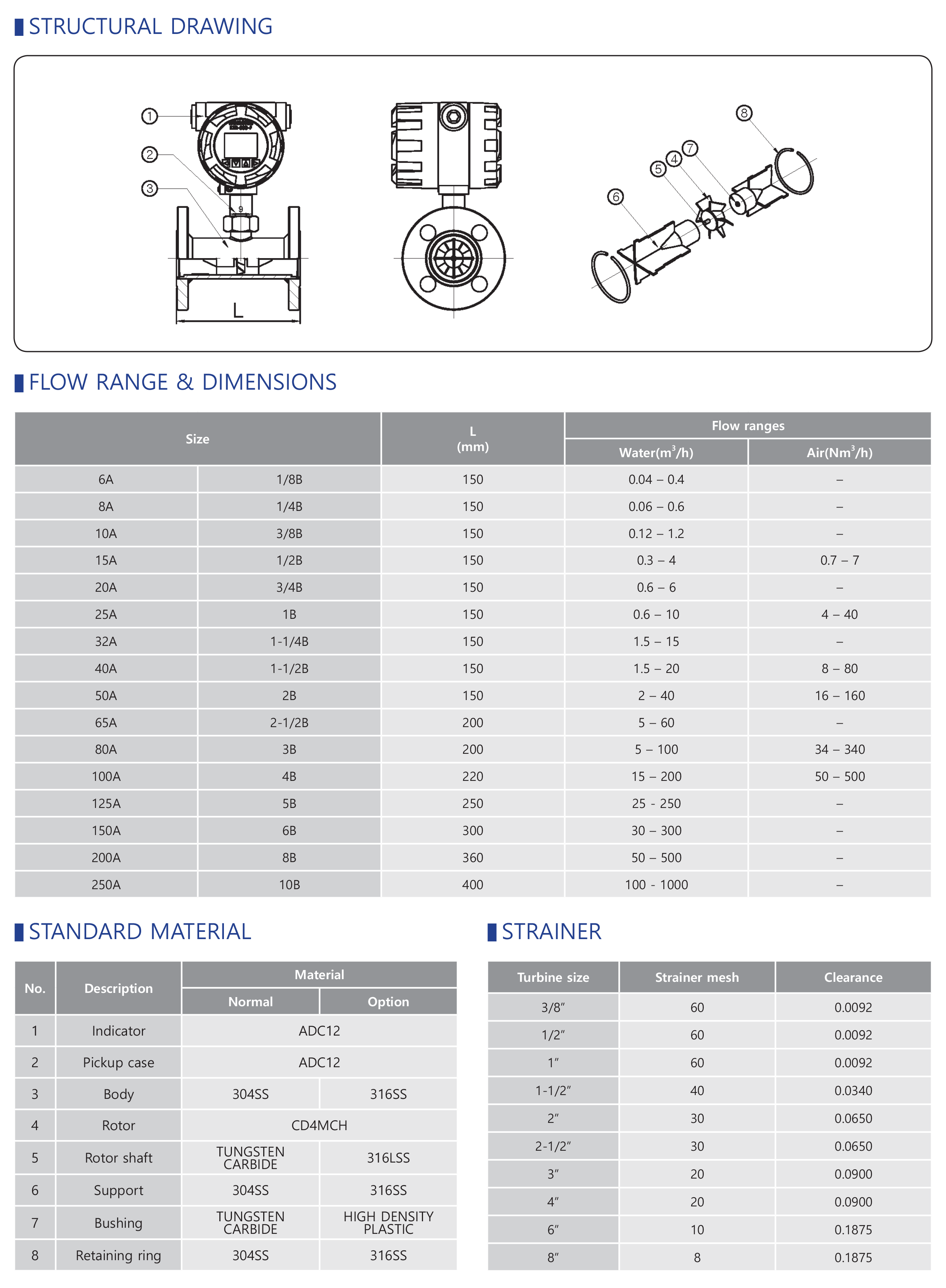 KTR-550-F Series is a turbine flow meter having a mechanical section combined with electronic board displaying the flow rate, the end connection of which is finished with a flange. Because its driving part is mechanical, it can be applied for all fluids of low temperature to high temperature with relatively high accuracy and excellent reproducibility.