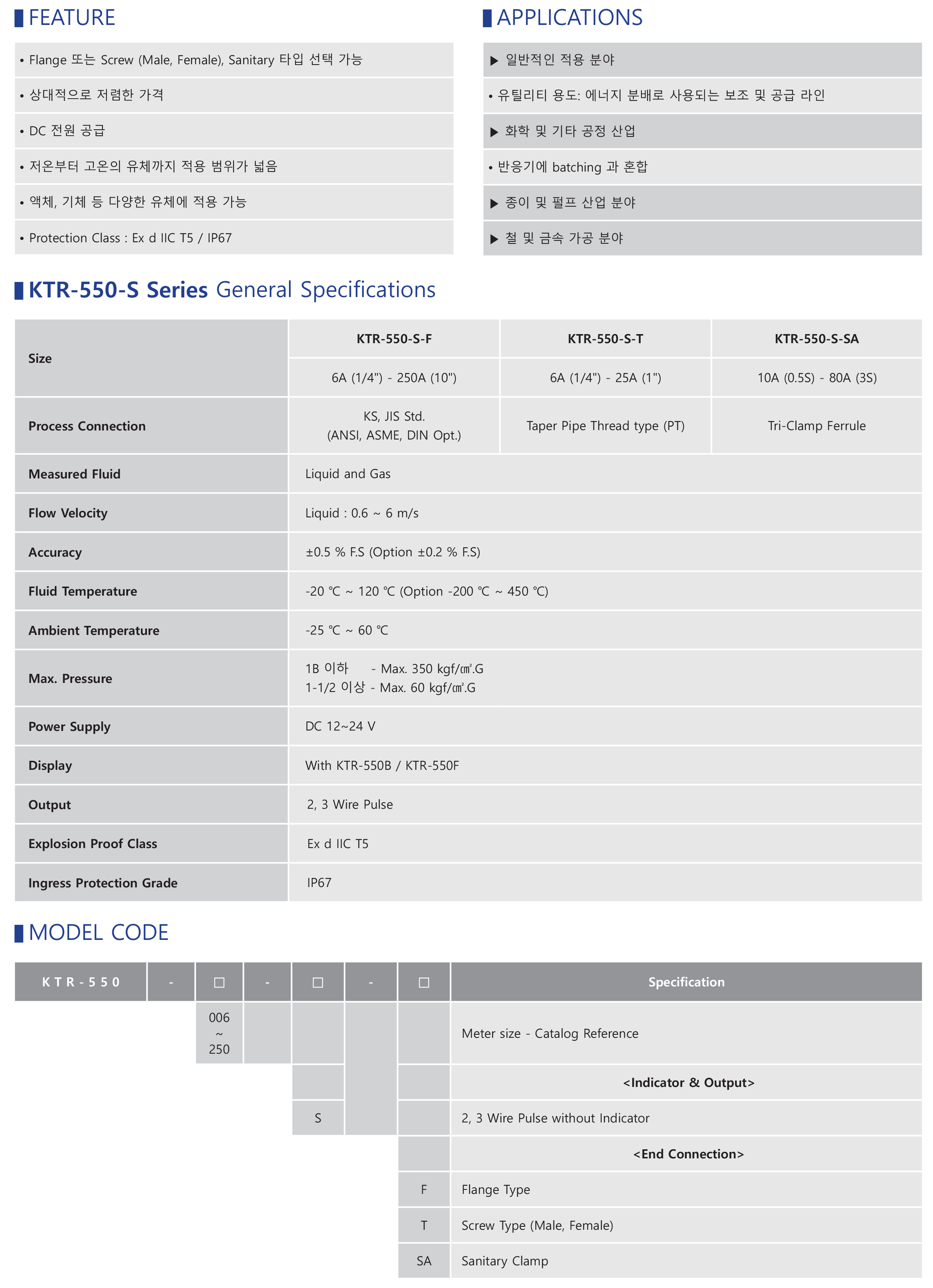 KTR-550-S Series 는 알코올, 톨루엔 등의 전기 전도도가 없는 유체에 적용가능하며 석유 가스, 발전소, 제약 및 펄프 & 제지 등의 산업 현장에 또한 이용 할 수 있습니다. 그러나 슬러지가 있거나 점도가 높은 유체에는 사용하지 않는 것을 권장 드립니다. 또한 플랜지 타입 또는 Screw (Male, Female) 타입, Sanitary 타입으로도 제공 가능하여 다양한 배관 조건에 충족 가능합니다.