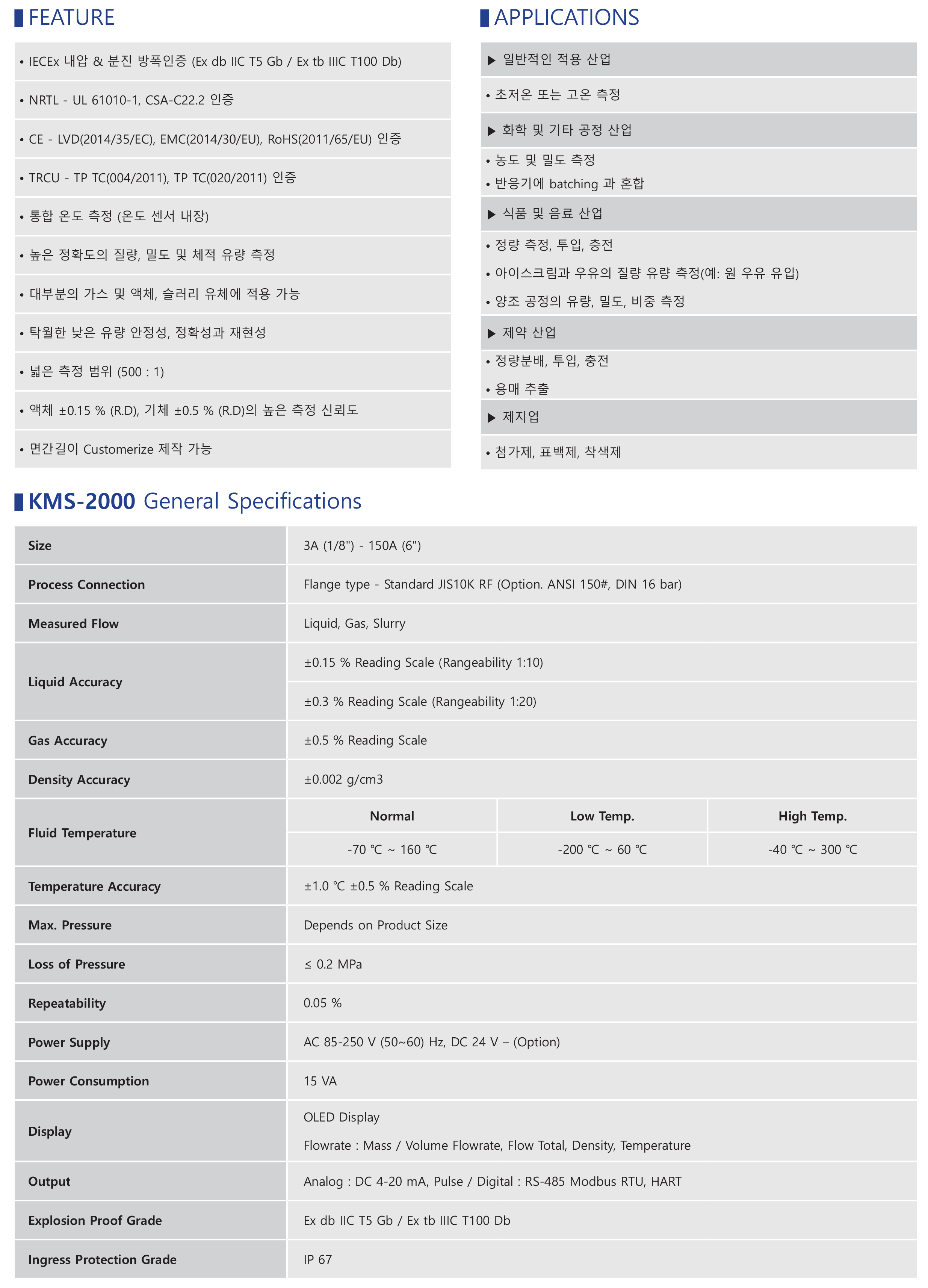 KMS-2000  은 공정 산업을 위한 표준형 고성능 코리올리스 질량 유량계입니다. 두 개의 곡선 튜브가 장착 된 유량계는 실질적으로 모든 응용 분야에서 우수한 성능과 높은 정확도를 제공합니다. 석유 및 화학 산업에서의 프로세스 제어에서부터 식음료 산업의 농축측정, 그리고 또한 정유와 가스 산업분야에서 거래용 충전과 운송에서 모두 최적의 제품입니다.
