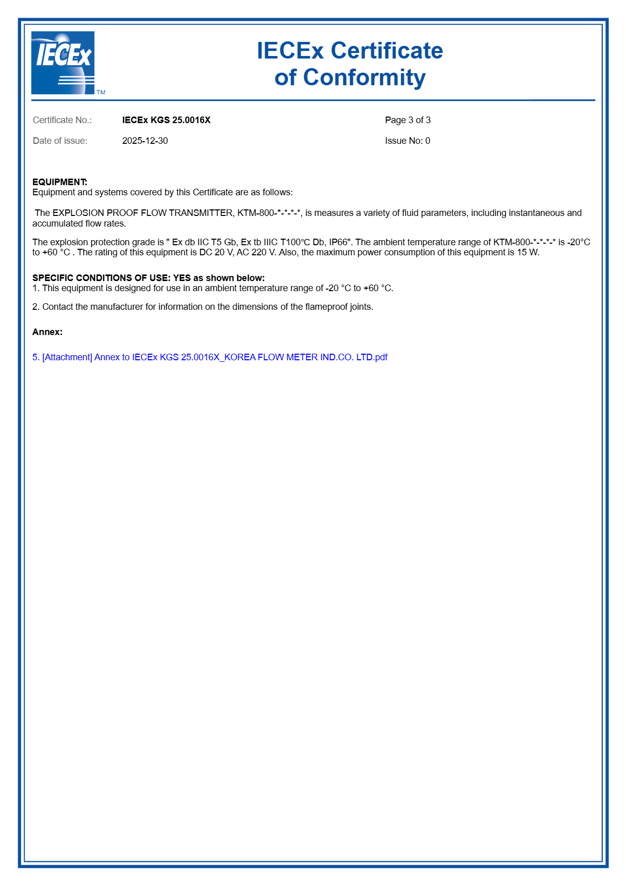 KTM-800-Ex Series (전자기 유량계) IECEx 내압, 분진 방폭 인증 획득